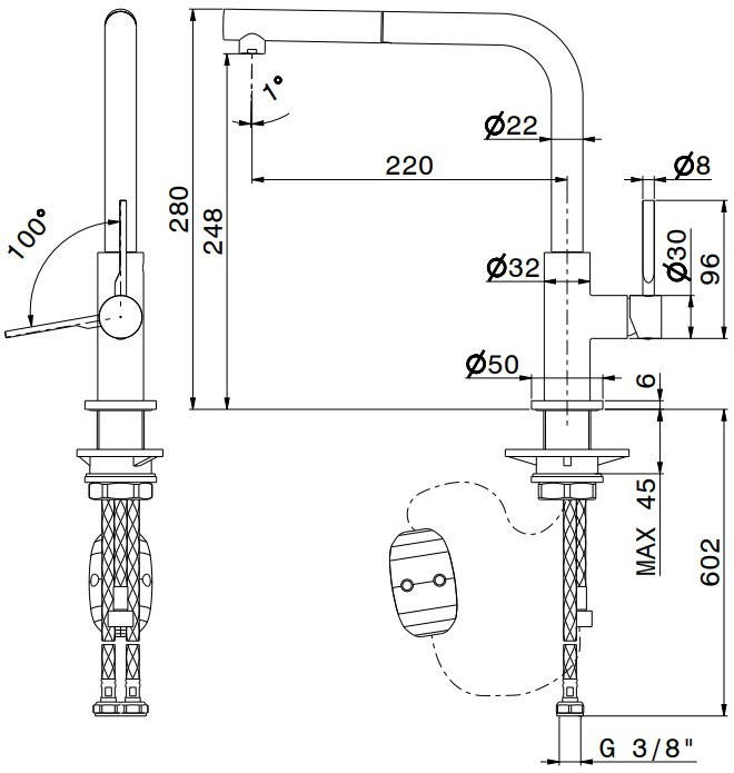 Висота змішувача - 280 мм,
