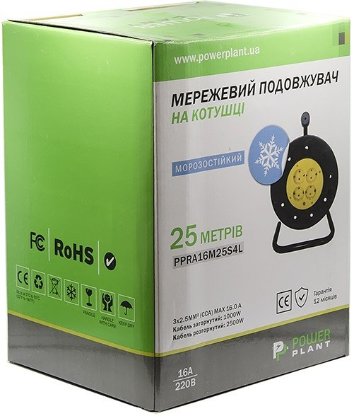 Подовжувач на котушці PowerPlant 25 м, 3x2.5мм2, 16А, 4 розетки, морозостійкий (JY-200225) (PPRA16M25S4L)