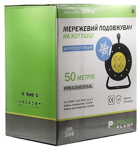Подовжувач на котушці PowerPlant 50 м, 3x2.5мм2, 16А, 4 розетки, морозостійкий (JY-200250) (PPRA16M50S4L)