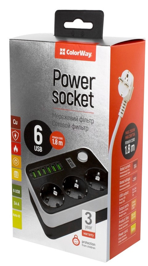 Фільтр живлення ColorWay CW-CHE36B 3 розетки, 6 USB, 1.8 м, чорний