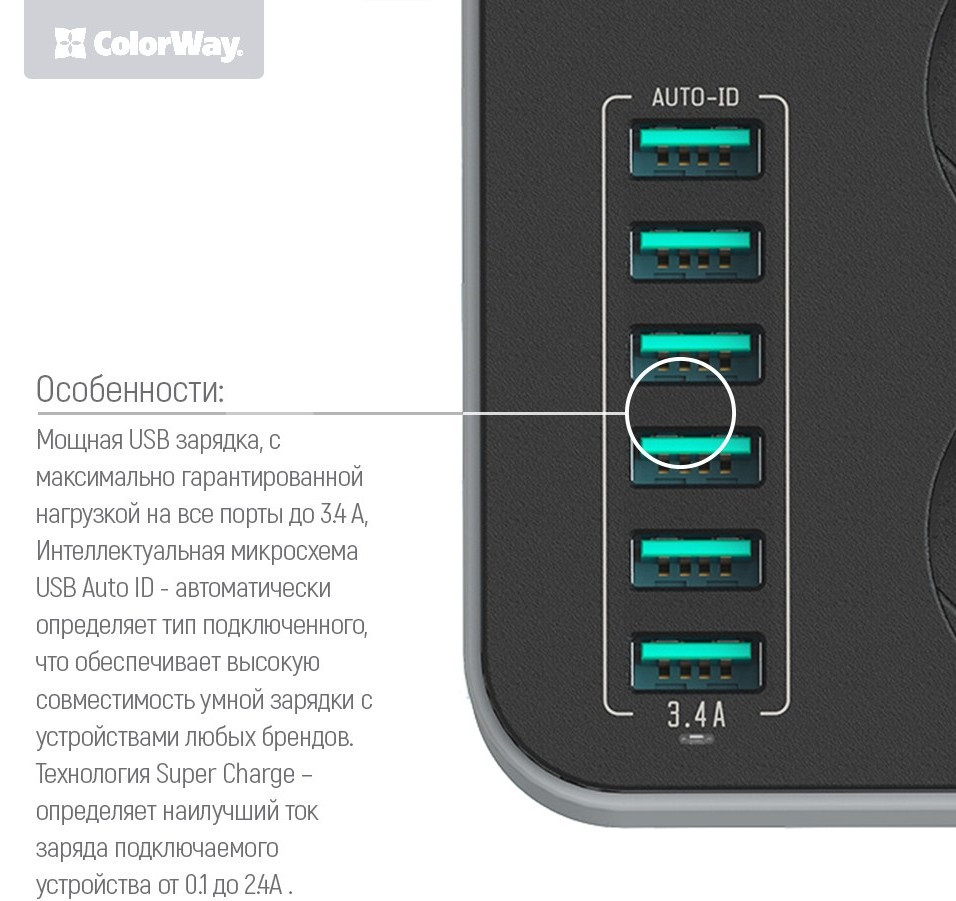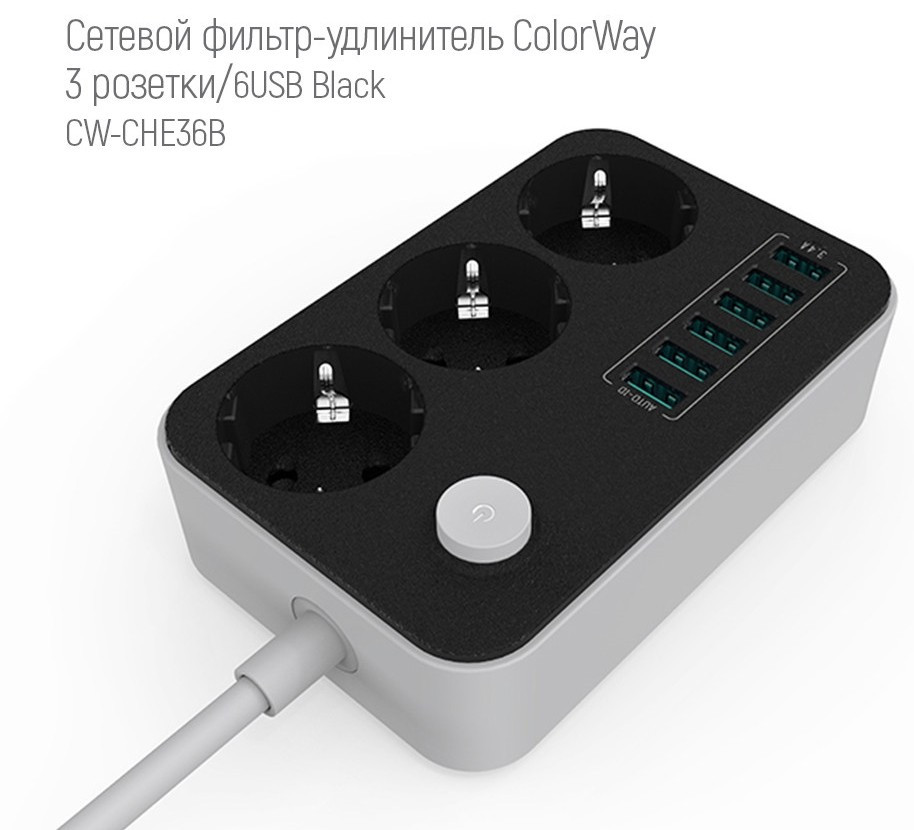 Мережевий фільтр живлення ColorWay CW-CHЕ36B, 3 розетки6USB Black 1.8M (CW-CHE36B)