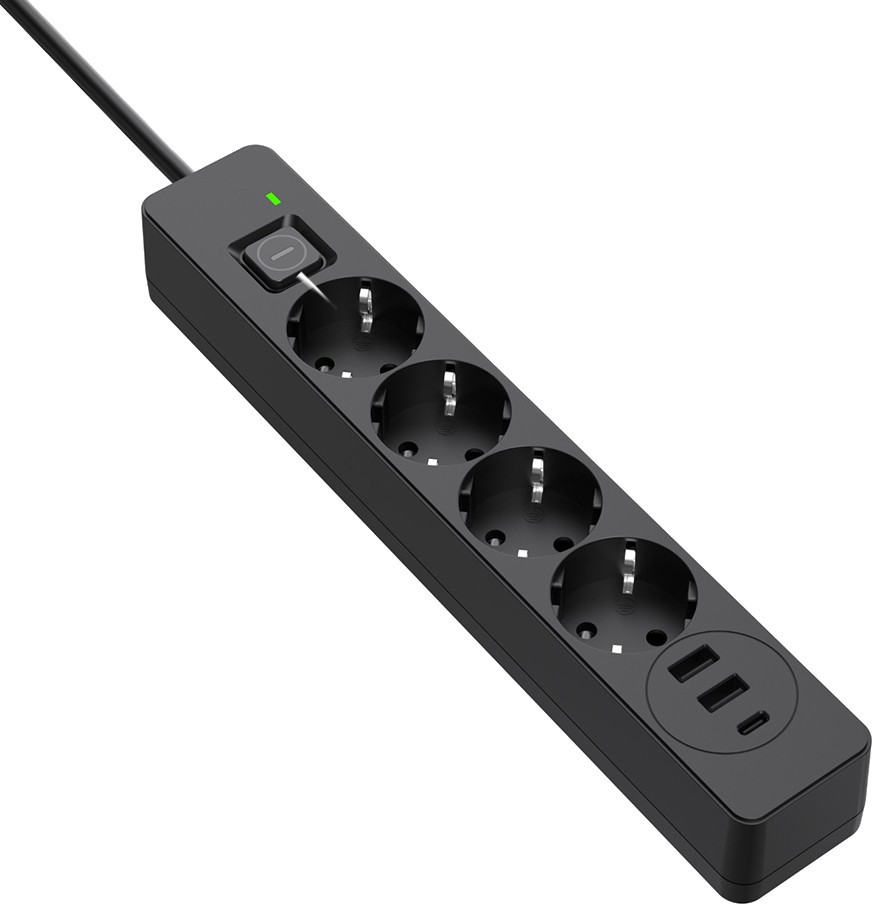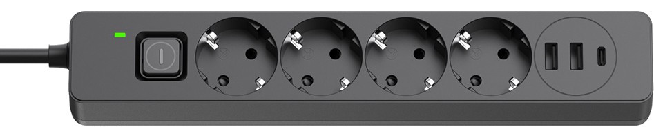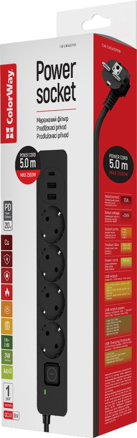 Фільтр живлення ColorWay CW-CHE435PDB 4 розетки, 3USB (2USB-A + 1 TYPE-C) (24W), 2м, Black