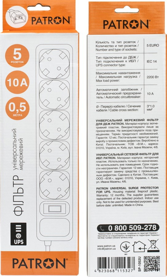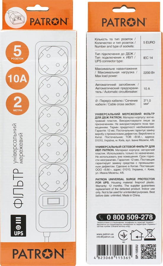 Мережевий фільтр живлення PATRON 2 m3*1mm2 (SP-1055U) 5 розеток BLACK (EXT-PN-SP-1055U)