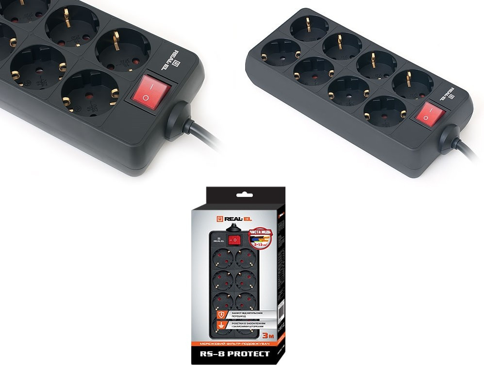 Мережевий фільтр живлення REAL-EL REAL-EL RS-8 PROTECT, 3m, black (EL122300022)