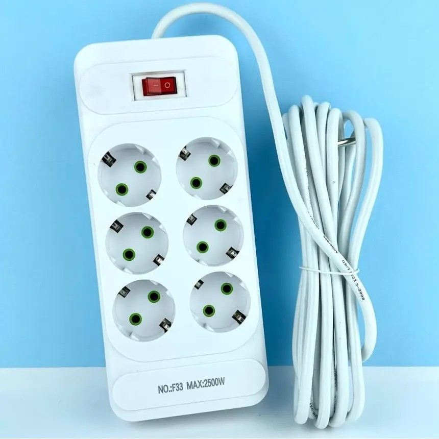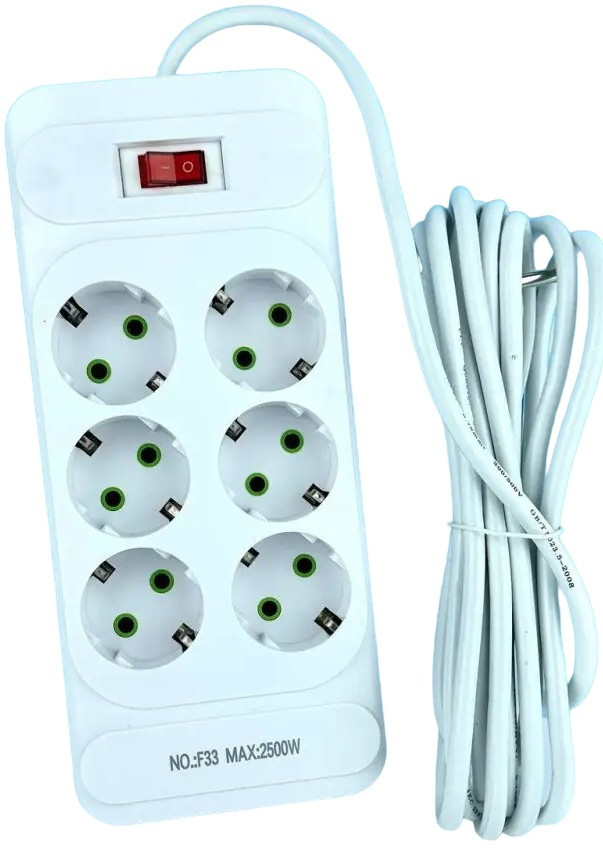 Мережевий фільтр F33, 6 розеток EU, кнопка включення з індикатором, 2 м, 3х0,75 мм, 2500W, White, Box