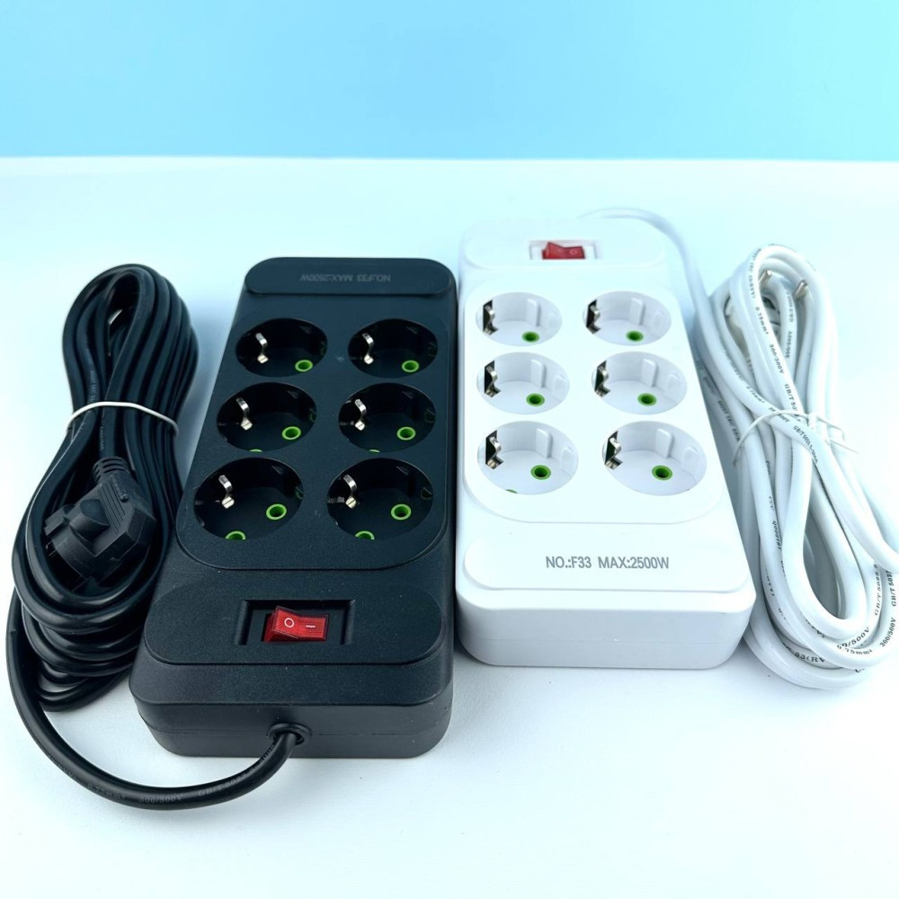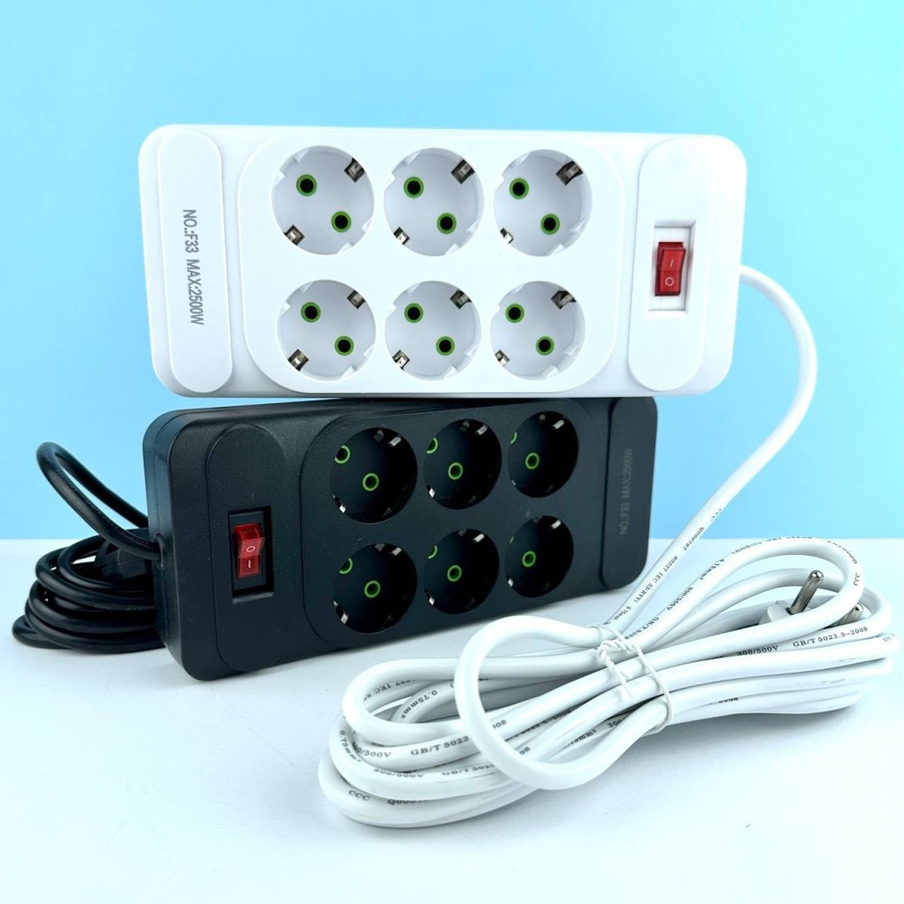 Фільтр мережі F33, 6 розеток EU, кнопка включення з індикатором, 2 м, 3х0,75мм, 2500W, Black, Box